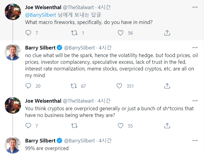 이에 한 유저가 매크로 불꽃놀이가 무엇을 의미하느냐고 묻자, '암호화폐 왕'(Crypto King)으로 불리는 배리 실버트는 "어떤 불똥이 튈지 모르기 때문에 변동성 헤지(위험회피)를 택했다. 식자재 가격, 유가, 투자자들의 안일함, 투기과잉, 연준에 대한 신뢰 부족, 금리 정상화, 밈 주식, 암호화폐의 과대평가 등 모든 것이 마음에 걸린다"고 답했다.