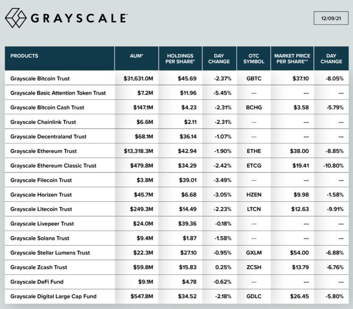 암호화폐 투자펀드 그레이스케일이 공식 트위터를 통해 12월 9일 기준 총 운용자산(AUM) 규모가 약 466억 달러를 기록했다고 밝혔다. 그레이스케일 비트코인 트러스트(GBTC) 판매 단위 가격은 전날 대비 8.05% 하락한 37.10 달러, 그레이스케일 이더리움신탁(ETHE)은 8.85% 하락한 38.00 달러에 거래되고 있다.
