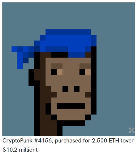더블록에 따르면 누군가 2,500 ETH(당시 시가 기준 약 1020만 달러)에 희귀(Rare)한 크립토펑크를 구매했다. 해당 펑크는 #4156로, 만 개 중 24개만 있는 에이프펑크(Ape Punk) 중 하나다. 미디어는 "희귀 크립토펑크의 경우 거래가 거의 발생하지 않는다. 극히 드문 거래 케이스"라고 평가했다.