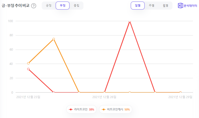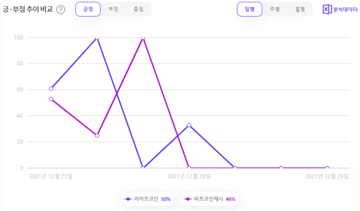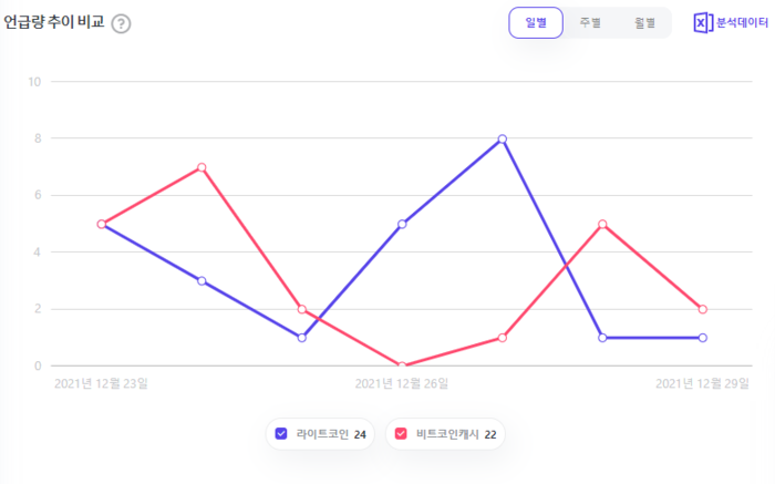 라이트코인 vs 비트코인캐시, 언급량 추이는? 12월 23일부터 12월 29일까지 일주일간 라이트코인은 24회, 비트코인캐시는 22회 언급됐다.
