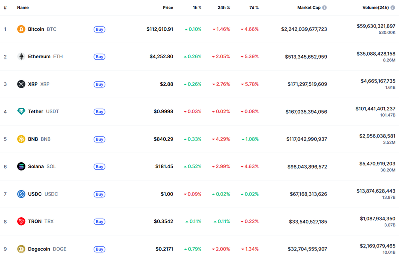 8월 22일(한국시간) 암호화폐 전문매체 코인마켓캡에 따르면, 비트코인은 전일 대비 1.46% 하락한 11만 2,610달러 선에서 거래되고 있다. 이더리움은 2.05% 떨어진 4,252달러, 엑스알피(XRP)는 2.76% 밀린 2.88달러에 머물렀다. 시가총액 상위 코인 대부분이 일제히 약세를 기록하며 시장 전반에 매도세가 확산됐다.