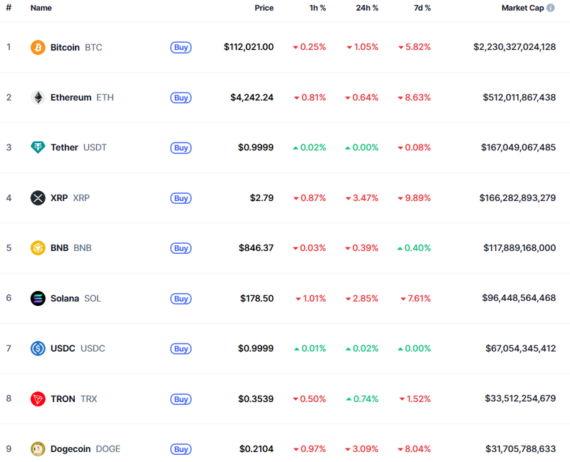 8월 22일 오후 9시 22분(한국시간) 기준 코인마켓캡에 따르면 비트코인(Bitcoin, BTC)은 11만 2,021달러로 24시간 전 대비 1.05%, 최근 7일간 5.82% 하락했다. 시가총액은 2조 2,303억 달러로 여전히 1위를 지키고 있으나 단기 약세가 두드러지고 있다.