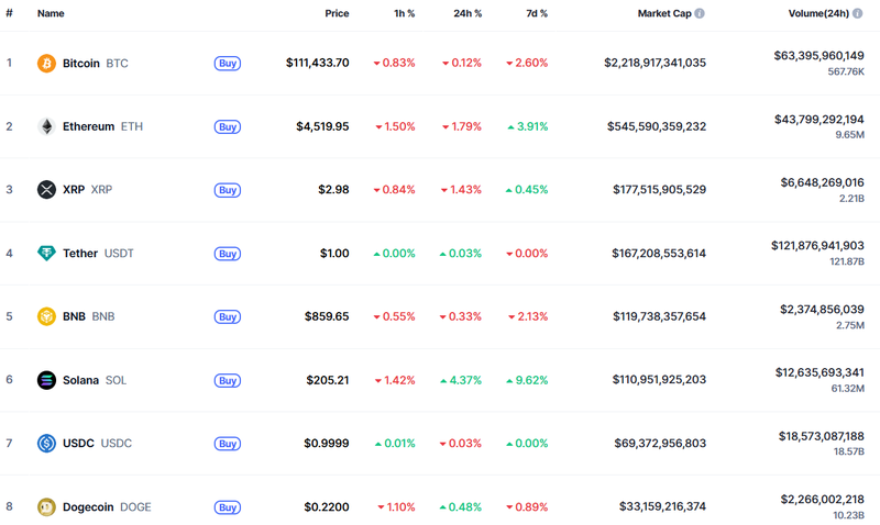 8월 28일 오전 6시 55분 기준 코인마켓캡 자료에 따르면, 비트코인(BTC)은 11만 1,433달러로 전일 대비 0.12% 하락했고, 이더리움(ETH)은 4,519달러로 1.79% 내렸다. 엑스알피(XRP, 리플)도 2.98달러로 1.43% 약세를 기록하며 주요 코인들이 동반 하락세를 보였다. 반면 솔라나(SOL)는 205달러로 24시간 기준 4.37%, 7일 기준 9.62% 급등하며 독보적인 상승세를 이어갔다.