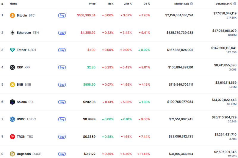 8월 30일(현지시간) 암호화폐 전문매체 코인마켓캡에 따르면, 비트코인(Bitcoin, BTC)은 현재 10만 8,300달러 선까지 밀리며 24시간 동안 3.67%, 일주일 동안 7.20% 하락했다. 시가총액 2조 1,560억 달러 규모의 대표 코인마저 낙폭을 피하지 못하면서 투자 심리가 위축된 모습이다.