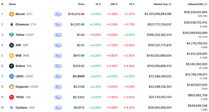 시가총액 1위 비트코인(Bitcoin, BTC)은 11만 513달러로 소폭 하락해 24시간 기준 1.38% 내렸고, 7일 누적으로도 1.37% 떨어졌다. 거래량은 582억 달러 수준을 유지했지만 상승 탄력은 제한적이다. 이더리움(Ethereum, ETH)은 4,322달러까지 밀리며 하루 동안 3.24% 하락했고, 1주일 누적 낙폭은 3.75%에 달했다.