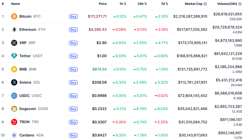 시장 개요 비트코인(Bitcoin, BTC)은 11만 1,271달러 선을 유지하며 0.47% 상승, 7일 기준으로는 2.10% 올랐다. 시가총액은 2조 2,162억 달러를 기록해 여전히 시장 지배력을 견고히 유지하고 있다. 이더리움(Ethereum, ETH)은 4,290달러로 소폭 하락하며 최근 일주일간 3.19% 내렸다. 반면, 리플의 엑스알피(XRP)는 2.90달러로 24시간 동안 2.55%, 7일간 4.71% 상승하며 강세를 보였다.