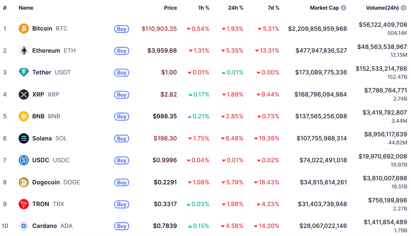 실제로 코인마켓캡 기준, 25일 비트코인은 11만 903달러로 하루 새 1.9% 하락했고, 이더리움은 3,959달러로 5.3% 급락했다. 시가총액 상위 알트코인인 솔라나는 19% 가까이 밀리며 200달러 선이 붕괴 위기에 놓였다. 도지코인과 카르다노 역시 각각 18.4%, 14.2% 급락해 알트코인 전반이 낙폭을 확대했다.