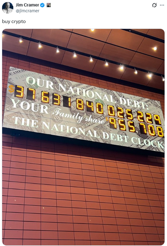 크레이머는 같은 날 뉴욕의 미국 국가부채시계 앞에서 찍은 사진을 X에 올리며 “암호화폐를 사라”고 공개적으로 권고했다. 현재 시계에 표시된 미국 부채는 37조 6,300억 달러로, 미국 가구당 평균 약 95만 6,000달러의 빚에 해당하는 수준이다. 이는 ‘가구당 100만 달러 부채’라는 상징적 경계선에 근접한 수치다.