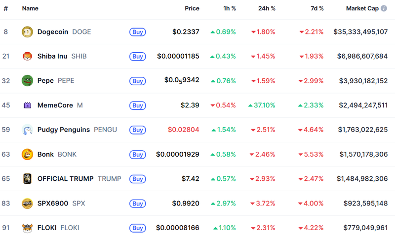 밈코인 시장이 전반적으로 약세를 보이고 있다. 비트코인이 11만 달러대에서 횡보하는 가운데, 투자 심리는 알트코인 중 특히 밈코인 섹터에서 위축된 모습이다.
