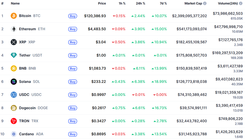 10월 3일(한국시간) 암호화폐 시황중계사이트 코인마켓캡에 따르면, 비트코인(BTC)은 전일 대비 2.44% 상승한 12만 386달러를 기록하며 시가총액 2조 3,990억 달러를 유지했다. 이더리움(ETH)은 3.90% 급등해 4,483달러를 기록했고, 리플(XRP)도 3.86% 상승해 3.04달러에 거래되고 있다.