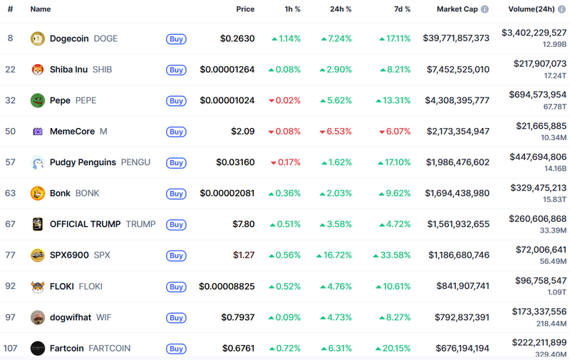 밈 코인 중 가장 두드러진 상승은 SPX6900(SPX)이다. 이 종목은 24시간 동안 16.72%, 최근 7일간 무려 33.58% 폭등해 1.27달러를 기록했다. 시장 규모는 11억 달러로 아직 작지만, 단기 급등에 따른 거래량이 집중되고 있다.
