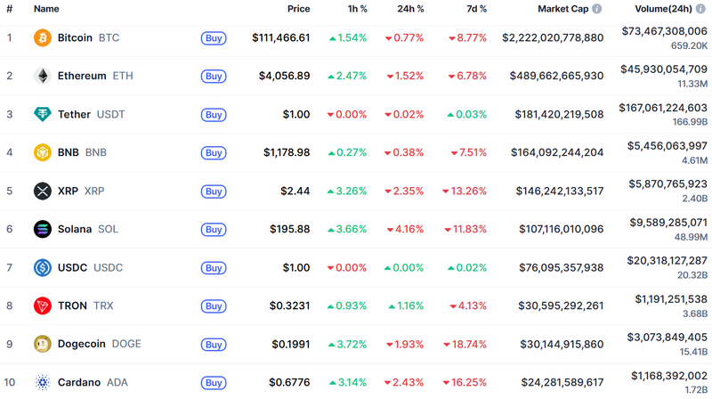 코인마켓캡 시황에 따르면, 비트코인(Bitcoin, BTC)은 11만 1,466.61달러로 24시간 전보다 0.77% 하락했다. 7일 기준으로는 8.77% 떨어지며 투자심리가 위축된 흐름을 보여주고 있다. 이더리움(Ethereum, ETH)도 4,056.89달러로 1.52% 하락하며 7일 기준 6.78% 하락폭을 기록했다.
