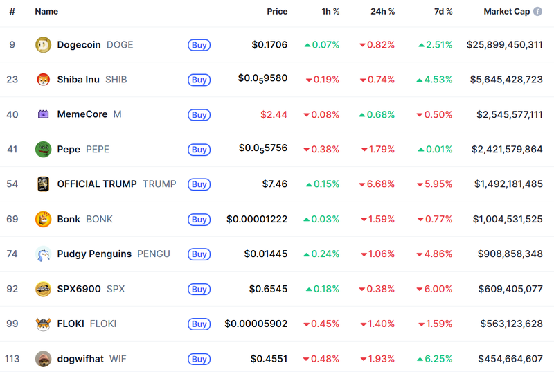 11월 13일(한국시간) 오전 6시 45분 현재 암호화폐 시황중계사이트 코인마켓캡에 따르면, 대표 밈 코인들이 일제히 약세를 이어가고 있다. 뉴욕증시가 셧다운 해제 기대 속에서도 혼조로 마감하면서 위험자산 전반에 신중론이 확산된 영향이다.