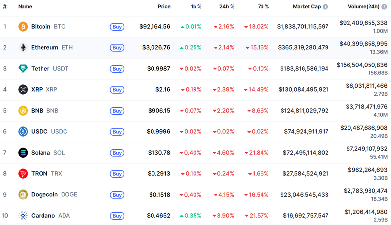 18일 오전 9시 5분(한국시간) 암호화폐 시황 중계사이트 코인마켓캡에 따르면, 비트코인(Bitcoin, BTC)은 전일 대비 2.16% 하락한 9만 2,164.56달러를 기록했다. 7일 기준 낙폭은 13.02%에 달했다. 이더리움(Ethereum, ETH)은 3,026.76달러로 2.14% 떨어졌고, 엑스알피(XRP)는 2.39% 하락한 2.16달러에 거래됐다. 솔라나(Solana, SOL)는 하루 만에 4.60% 급락해 130.78달러까지 후퇴하며 낙폭이 가장 컸다.