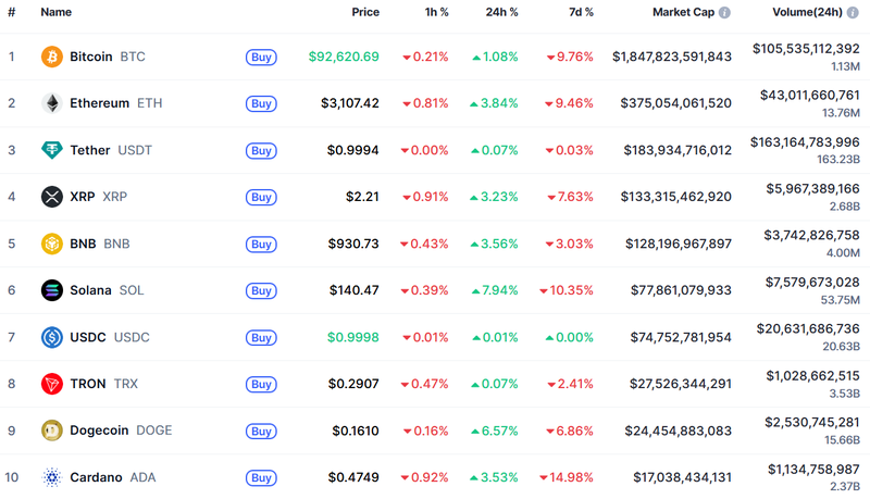 한국시간 19일 오전 6시 30분 현재 코인마켓캡 기준 1위 비트코인(Bitcoin, BTC)은 9만 2,620달러 선을 기록하며 24시간 전보다 1.08% 상승했다. 이더리움(Ethereum, ETH)도 3.84% 올라 3,107달러대를 회복했다. 시총 상위 알트코인도 대부분 반등했고, 솔라나(Solana, SOL)는 7%대 강세를 보이며 140달러선을 회복했다. 리플의 엑스알피(XRP)는 2.21달러로 24시간 기준 3.23% 올랐지만, 최근 7일간 낙폭은 여전히 7%대다.