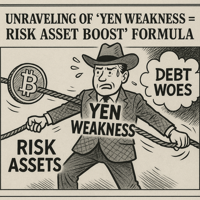 일본 엔화가 약세를 보이면 비트코인(BTC) 등 위험자산이 강세로 이어졌던 기존 현상이 약화되고 있다는 외신 분석이 나왔다. 코인데스크는 “심각한 부채 문제에 직면한 일본의 엔화는 이제 안전자산으로서의 역할을 뒷받침하지 못하고 있다. 엔화 캐리 트레이드에 대한 유인 요소가 약하다보니 비트코인과 알트코인 등 위험자산에 대한 투자 수요도 자극하지 못하고 있다. 여기에 일본 국채 수익률과 환율 간 상관관계까지 무너진 상황인데, 이는 시장 심리가 일본의 재정 문제에 대해 예민하게 반응하고 있음을 보여준다“고 설명했다. 그러면서 “일본은 현재 궁지에 몰린 상황이다. 금리 상승을 방치할 경우, 본격적인 재정 위기에 들어간다. 반대로 금리를 동결하면 본격적인 엔화 가치 하락과 수입 물가 상승에 직면한다“고 강조했다.