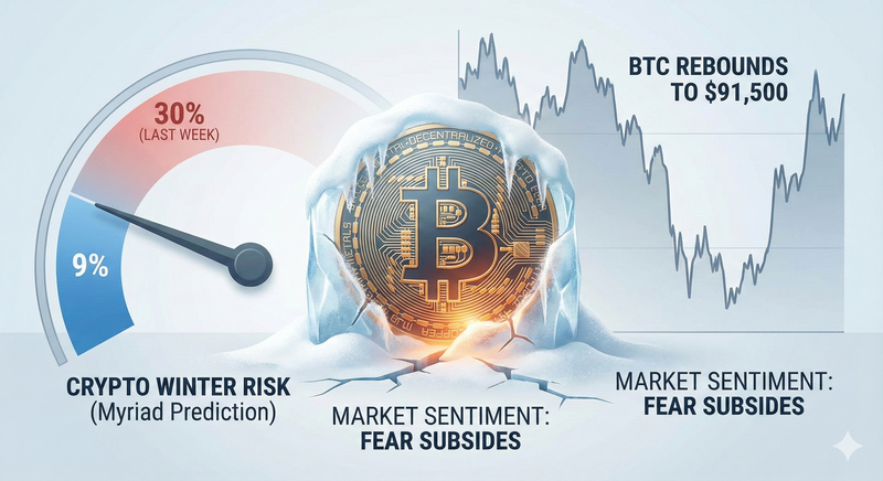 12월 3일(현지시간) 암호화폐 전문매체 디크립트에 따르면, 탈중앙 예측시장 미리아드(Myriad)의 사용자들은 시장이 본격적인 하락장으로 진입할 확률을 단 9퍼센트로 예측했다. 이는 시장 불안감이 극에 달했던 지난주, 비관적 전망이 30퍼센트까지 치솟았던 것과 비교하면 공포 심리가 대폭 완화된 수치다. 이러한 투자 심리 회복은 최근 6주간의 침체를 딛고 주요 자산 가격이 일제히 반등한 흐름과 궤를 같이한다.