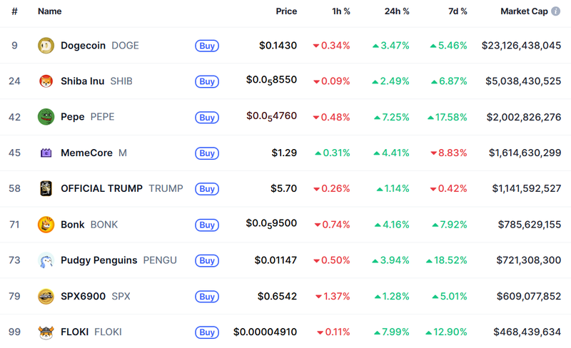 9일 오전 7시 40분(한국시간) 코인마켓캡에 따르면 도지코인(DOGE)은 0.143달러로 24시간 기준 3.47% 상승했다. 시가총액 2위 밈코인 시바이누(SHIB)는 0.00008550달러로 2.49% 오르며 하락 구간을 벗어나는 조짐을 보였다. 최근 부진했던 페페(PEPE)는 7.25% 상승하며 단기 반등세를 이끌었고, 밈코어(MemeCore)는 4.41% 올랐다. 트럼프 테마 토큰 오피셜 트럼프(TRUMP)는 1.14% 상승했다.