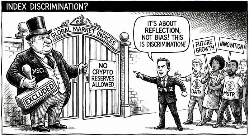 암호화폐 자산운용사 비트와이즈(Bitwise)가 모건스탠리캐피털인터내셔널(MSCI)가 암호화폐 비축 기업(DAT)을 MSCI 지수에서 편출하려는 움직임은 차별 행위라고 비판했다. 비트와이즈는 성명을 통해 "지수의 목적은 시장을 반영하는 것이지, 특정 비즈니스 모델의 장단점을 평가하는 것이 아니다. MSCI의 스트래티지(MSTR) 지수 편출 가능성 언급은 지수의 객관성·적격성 기준에 문제가 있을 수 있다고 여기게 만든다. 비트와이즈는 스트래티지를 비롯한 DAT들이 장기적으로 성공할 수 있다고 본다. MSCI가 DAT를 지수에서 편출할 경우, 이는 암호화폐에 대한 차별일 뿐만 아니라 가장 빠르게 성장하는 자산 클래스와 그 분야 관계자들에 대한 차별"이라고 강조했다.