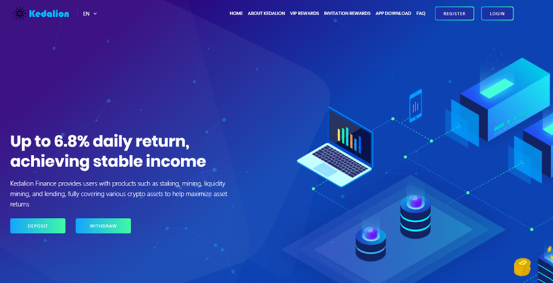 Kedalion은 스테이킹, 클라우드 마이닝, 유동성 마이닝, 대출 등 다양한 금융 상품을 제공하며, 공식 웹사이트에서는 특히 ‘스테이킹 기반 수익 모델’을 주요 서비스로 소개하고 있다. 동시에 전통적인 원격 채굴 방식에 기반한 클라우드 마이닝 상품도 핵심 수익원으로 운영되고 있다. 이 구조에서는 사용자가 별도의 하드웨어를 설치할 필요 없이 계정 생성만으로 참여가 가능하다.
