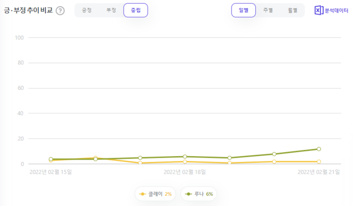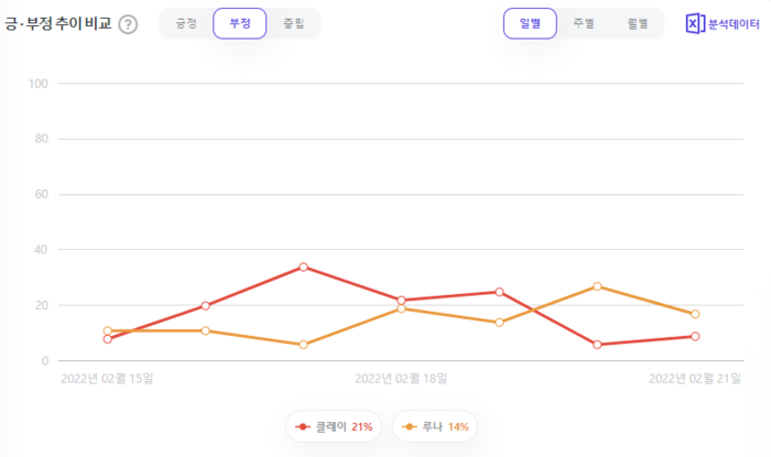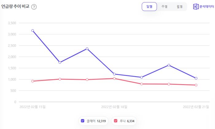 2월 15일부터 2월 21일까지 일주일간 클레이는 1만 2,319회, 루나는 6,334회 언급됐다.