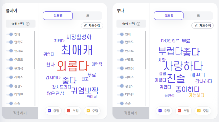 클레이 vs 루나, 이미지와 주요 감성어는? 클레이의 이미지는 긍정 77%, 부정 21%, 중립 2%로, 긍정적인 이미지를 보유한 것으로 확인됐다. 주요 감성어 중, 긍정적인 표현은 ‘최애캐’, ‘좋다’, ‘매력적’, ‘무료’, ‘최고’, ‘지리다’, ‘감사하다’, ‘많은 관심’ 등이 있다. 부정적인 표현은 ‘외롭다’ 단 하나이며, 중립적인 표현은 없다.