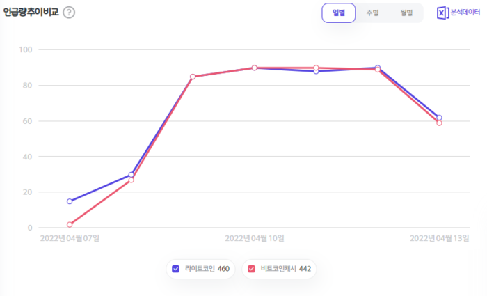 4월 7일부터 4월 13일까지 일주일간 라이트코인은 460회, 비트코인캐시는 442회 언급됐다. 지난 일주일 중 라이트코인의 언급량이 급증한 4월 9일, 라이트코인 재단이 DHL을 포함한 여러 기업의 라이트코인 결제 지원 계획을 발표했다.