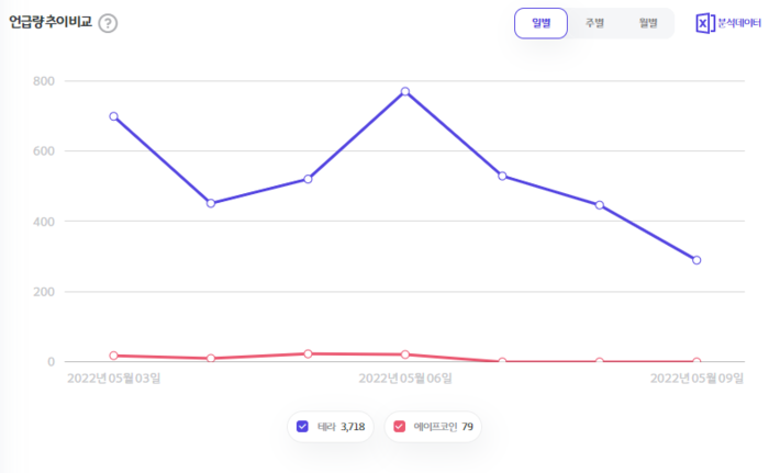 5월 3일부터 5월 9일까지 일주일간 테라는 3,718회, 에이프코인은 79회 언급됐다.