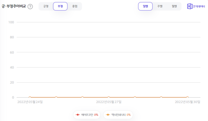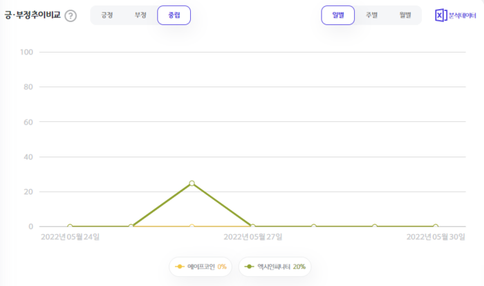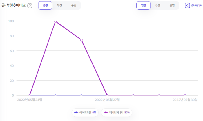 5월 24일부터 5월 30일까지 일주일간 에이프코인은 2회, 엑시인피니티는 26회 언급됐다.