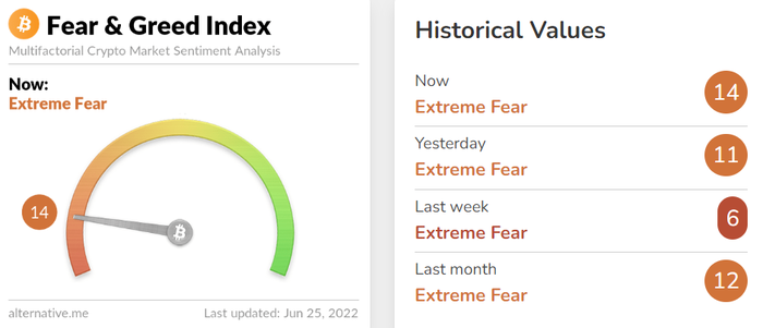 비트코인의 투자심리도 소폭 개선된 모습이다. 25일(한국시간) 암호화폐 데이터 제공 업체 알터너티브(Alternative)의 자체 추산 '크립토 공포·탐욕 지수'에 따르면 해당 지수는 전날보다 3포인트 오른 14를 기록했다. 다만 '극단적 공포' 단계는 지속됐다.