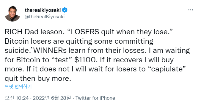앞서 지난달 기요사키는 트위터에 "비트코인 폭락은 좋은 소식이다. 앞서 나는 비트코인 가격이 20,000달러 아래로 떨어지면 추가 매수할 것이라고 말한 바 있다. 지금 17,000달러 바닥 테스트를 기다리고 있으며, 이때 추가 매수를 할 예정이다. 급락은 부자가 되기 가장 좋은 때"라고 전했다.