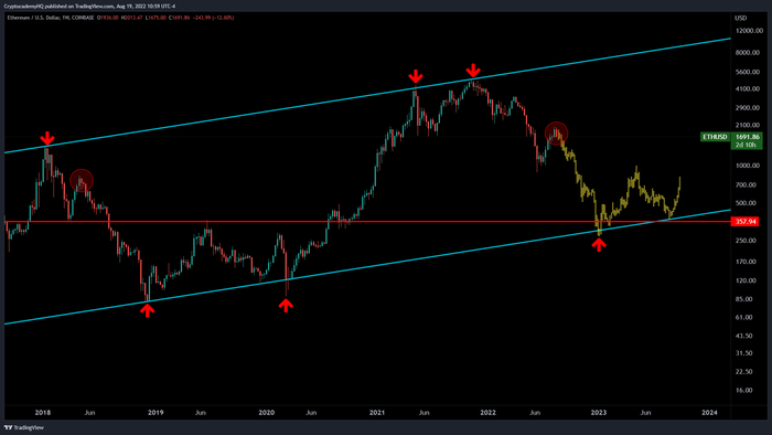 그는 코인베이스 ETH/USD 주봉차트를 인용하며 "2019년부터 저점을 이은 지지선, 고점을 이은 저항선으로 구성된 상승 채널에서 ETH가 지지선을 터치한다는 가정 하에 저점은 300 달러 부근에 형성될 가능성이 있다"고 설명했다.