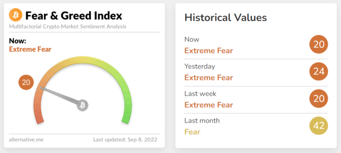 8일(한국시간) 암호화폐 데이터 제공 업체 알터너티브(Alternative)의 자체 추산 '크립토 공포·탐욕 지수'에 따르면 해당 지수는 전날 대비 4포인트 내린 20을 기록했다. 투심이 위축되면서 극단적 공포 단계가 지속됐다. 해당 지수는 0에 가까울수록 시장의 극단적 공포를 나타내며, 100에 가까울수록 극단적 낙관을 의미한다.