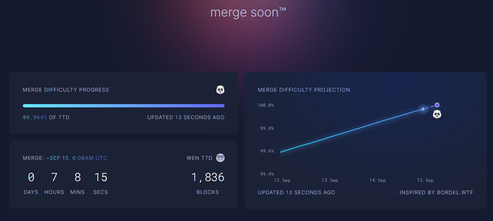 한편 이더리움 소각 관련 데이터 플랫폼 울트라사운드머니(Ultrasoundmoney)에 따르면, 15일(한국시간) 오전 7시 58분 현재 기준 이더리움 머지(PoS 전환)가 약 7시간 앞으로 다가왔다.