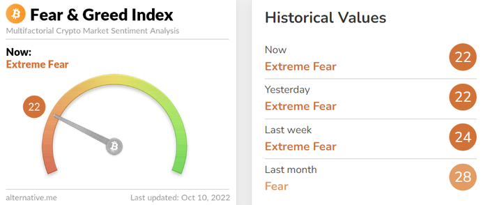 투자심리 위축세도 지속되는 모습이다. 10일(한국시간) 암호화폐 데이터 제공 업체 알터너티브(Alternative)의 자체 추산 '크립토 공포·탐욕 지수'에 따르면 해당 지수는 전날과 동일한 22를 기록하며 '극단적 공포' 단계가 지속됐다.