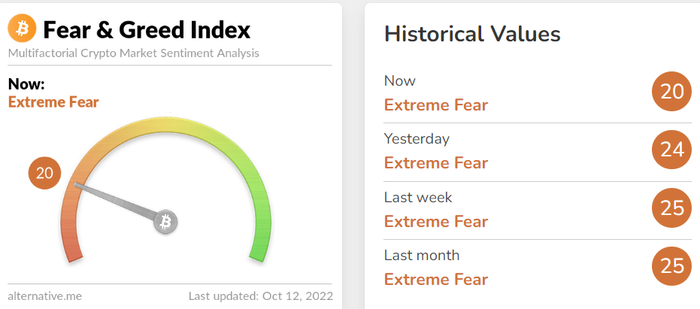 12일(한국시간) 암호화폐 데이터 제공 업체 얼터너티브(Alternative)의 자체 추산 '크립토 공포·탐욕 지수'에 따르면 해당 지수는 전날보다 4포인트 떨어진 20를 기록하며 '극단적 공포' 단계가 지속됐다. 해당 지수는 0에 가까울수록 시장의 극단적 공포를 나타내며, 100에 가까울수록 극단적 낙관을 의미한다.