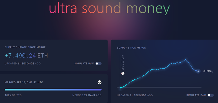 이날 이더리움 소각 물량 추적 플랫폼 울트라사운드머니(ultrasoundmoney)에 따르면, 이더리움 머지 후 ETH 유통량이 약 7,490 ETH 증가한 것으로 나타났다.
