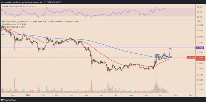 17일(현지시간) 아슈 골라 분석가는 "바이낸스 XRP/USDT 일봉차트 기준 불 페넌트(bull pennant) 패턴이 관측되고 있다. 해당 패턴은 강한 상승세 이후 삼각수렴을 거친 뒤 상승세가 이어지는 패턴을 의미한다. 현재까지 XRP는 삼각수렴 상방 이탈을 두 차례 시도했지만 아직 성공하진 못했다. 향후 며칠간 이러한 돌파 시도가 이어질 것으로 전망된다"며 "이론적으로 페넌트 돌파는 2022년 4분기에 가격을 0.63달러까지 올릴 수 있다. 이는 35% 가격 상승을 의미한다"고 분석했다.