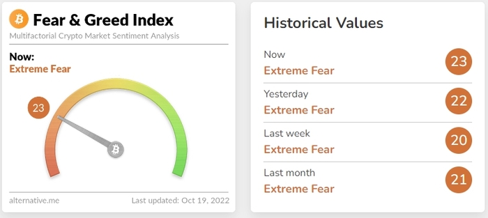 투자심리 위축세도 지속되고 있다. 19일(한국시간) 암호화폐 데이터 제공 업체 얼터너티브(Alternative)의 자체 추산 '크립토 공포·탐욕 지수'에 따르면 해당 지수는 23을 기록하며 '극단적 공포' 단계가 계속됐다.