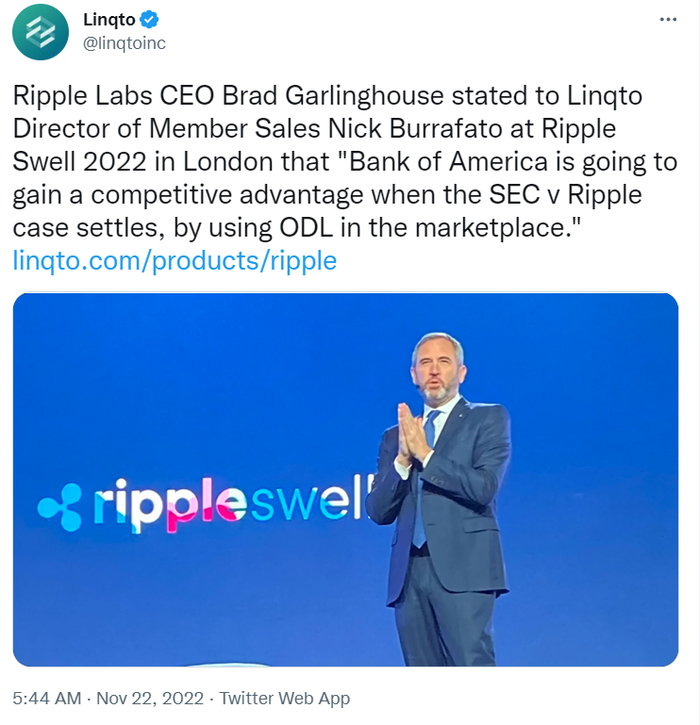 22일(현지시간) 암호화폐 전문매체 데일리호들에 따르면 투자 플랫폼 Linqto 디지털 자산 이사인 닉 부라파토(Nick Burrafato)가 "BofA가 리플과 ODL 관련 파트너십을 체결하기 위해 미국 증권거래위원회(SEC)와의 소송이 끝나기를 기다리고 있다고 브래드 갈링하우스(Brad Garlinghouse) 리플 최고경영자(CEO)에게 들었다"고 말했다.