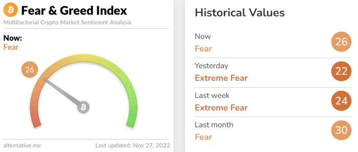 투자심리 위축세도 개선되고 있는 모양새다. 이날 암호화폐 데이터 제공 업체 얼터너티브(Alternative)의 자체 추산 '크립토 공포·탐욕 지수'에 따르면 해당 지수는 전날보다 4포인트 오른 26을 기록하며, '극단적 공포' 단계에서 '공포' 단계로 전환됐다. 해당 지수는 0에 가까울수록 시장의 극단적 공포를 나타내며, 100에 가까울수록 극단적 낙관을 의미한다.