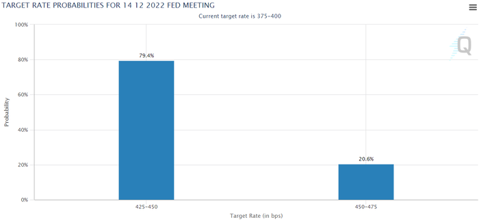 CME 페드워치 "12월 美기준금리 50bp 인상 가능성 79.4%...내년 2월 빅스텝 확률도 52.2%"12월 5일(현지시간) 시카고상품거래소(CME) 그룹의 페드워치에 따르면 이날 오전 3시 44분 현재 미 연방준비제도(Fed·연준)가 오는 12월 14일 예정된 공개시장위원회(FOMC) 회의에서 기준금리를 50bp(0.50%포인트, 1bp=0.01%포인트) 인상할 확률은 79.4%에 달했다. 75bp 금리 인상 가능성은 20.6%에 그쳤다. 내년 2월에 기준금리가 4.75%~5.00%로 인상될 가능성은 52.2%를, 5.00%~5.25%로 높아질 가능성은 11.1%를 각각 기록했다. 현재 미국 기준금리는 3.75∼4.00% 수준이다. 이날 월스트리트저널(WSJ)은 "오는 13∼14일 열리는 12월 FOMC 정례회의에서 0.5%포인트의 금리인상이 확실시되는 가운데 13일 발표 예정인 11월 소비자물가지수(CPI)가 높게 나올 경우 연준이 다음 회의인 내년 2월에도 연속 빅스텝(한 번에 0.5%포인트 금리인상)을 밟을 수 있다"고 지적했다.