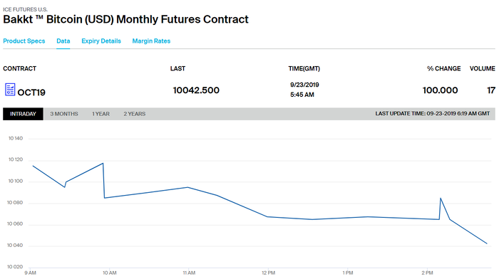 이날 ICE(인터컨티넨탈익스체인지) 산하 비트코인 선물 거래소 백트(Bakkt)가 공식 트위터를 통해 "백트의 BTC 선물 첫 거래가 9시 2분(한국시간) 성사됐다"고 밝혔다. 첫 거래가는 10,115달러로 현재까지 거래규모는 17BTC, 마지막 거래가는 10,042.500달러다.