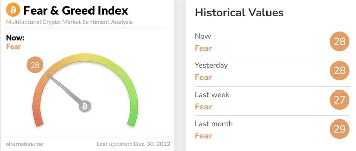 투자심리는 '공포' 단계를 유지하고 있다. 이날 암호화폐 데이터 제공 업체 얼터너티브(Alternative)의 자체 추산 '공포·탐욕 지수'는 전날과 동일한 28를 기록하며 '공포' 단계가 지속됐다.