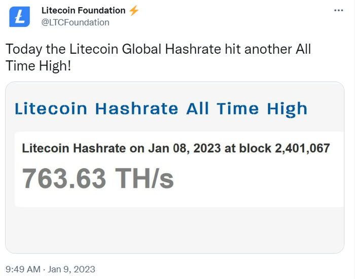 라이트코인(Litecoin, LTC) 재단이 9일(현지시간) 공식 트위터를 통해 라이트코인 해시레이트가 8일(현지시간) 763.63TH/s를 기록해 사상 최고치를 경신했다고 밝혔다. 가장 오래된 알트코인 중 하나이며 '디지털 은'으로도 불리는 라이트코인(LTC)은 9일(한국시간) 오전 11시 10분 현재 코인마켓캡 기준으로 24시간 전 대비 8.02% 급등한 81.78달러에 거래되고 있다. 현재 LTC 시총은 약 59억 달러로, 시총 10위인 폴리곤(MATIC, 시총 약 74억 달러)을 추격하고 있다.