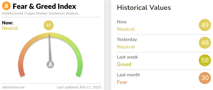 투자심리도 전주보다 위축된 모습이다. 10일(한국시간) 암호화폐 데이터 제공 업체 얼터너티브(Alternative)의 자체 추산 '공포·탐욕 지수'는 49를 기록하며 '중립' 단계를 유지했다. 전주는 58를 기록하며 '탐욕' 단계를 보였었다.