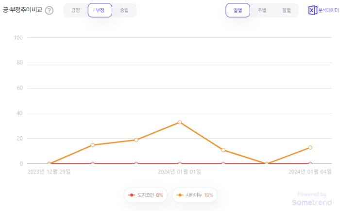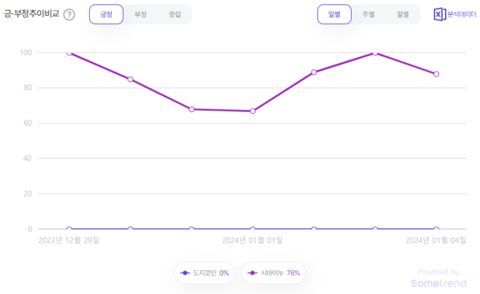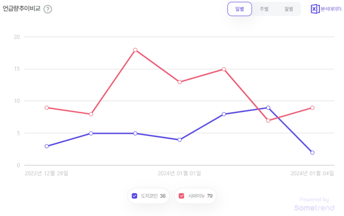 도지코인 vs 시바이누, 언급량 추이는? 12월 29일부터 1월 4일까지 일주일간 도지코인은 36회, 시바이누는 79회 언급됐다.