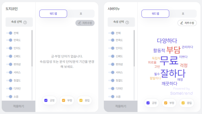 시바이누의 이미지는 긍정 76%, 부정 19%, 중립 5%로, 긍정 적인 이미지를 보유한 것으로 확인됐다. 주요 감성어 중, 긍정적인 표현은 ‘무료’, ‘잘하다’, ‘다양하다’, ‘활동적’, ‘깨끗하다’, ‘필수’ 등이 있다. 부정적인 표현은 ‘부담’, ‘걱정’, ‘외로움’, ‘고민’이 있으며, 중립적인 표현은 ‘독립적’, ‘활발하다’가 있다.