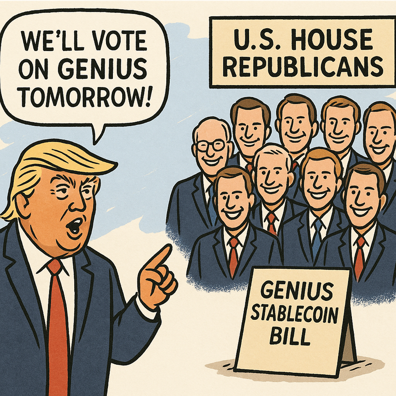 도널드 트럼프 미국 대통령이 11명 하원의원들과 미국 스테이블코인 규제법 지니어스(GENIUS)를 처리하기로 합의했다고 말했다. 현지시간으로 내일 아침 표결이 다시 진행될 예정이며, 미국 하원 의장 마이크 존슨도 신속한 표결을 지지한 것으로 알려졌다. 앞서 해당 법안은 본회의 상정을 위한 1차 절차 표결에서 과반 확보에 실패하며 부결된 바 있다.