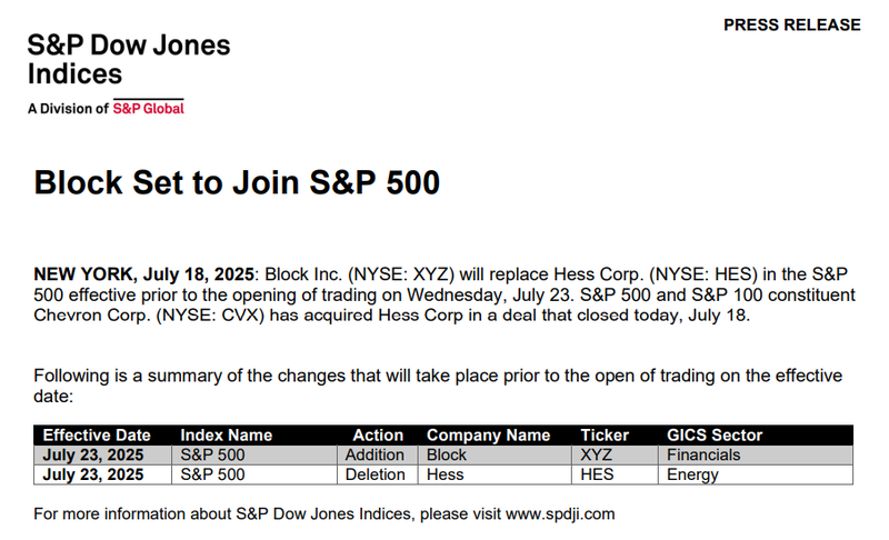 S&P 다우존스 인덱스는 보도자료를 통해 블록이 헤스코프(Hess Corp.)를 대체해 지수에 편입된다고 발표했다. 이번 결정은 셰브론(Chevron)이 헤스를 인수한 데 따른 것으로, 블록은 S&P 500 내 새롭게 합류하는 대표 비트코인(BTC) 기반 기업으로 주목받고 있다.